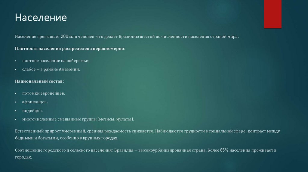 НаселениеНаселение превышает 200 млн человек, что делает Бразилию шестой по численности населения страной мира.