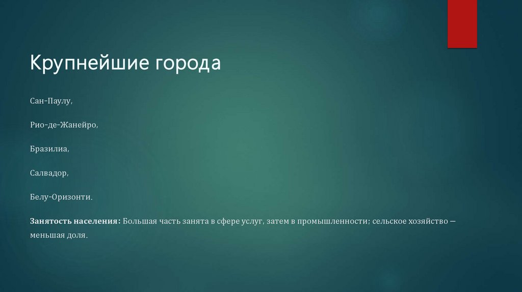 Соотношение городского и сельского населения: Бразилия — высокоурбанизированная страна. Более 85% населения проживает в