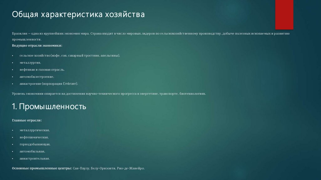 Общая характеристика хозяйстваБразилия — одна из крупнейших экономик мира. Страна входит в число мировых лидеров по сельскохозяйственному производству, добыче полезных ископаемых и развитию