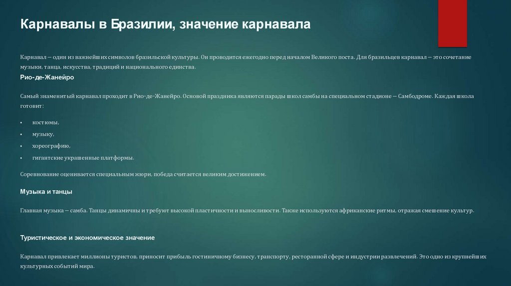 Карнавалы в Бразилии, значение карнавалаКарнавал — один из важнейших символов бразильской культуры. Он проводится ежегодно перед началом Великого поста. Для бразильцев карнавал — это сочетание