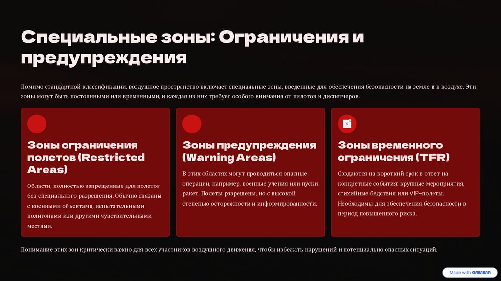 Помимо стандартной классификации, воздушное пространство включает специальные зоны, введенные для обеспечения безопасности на земле и в воздухе. Эти