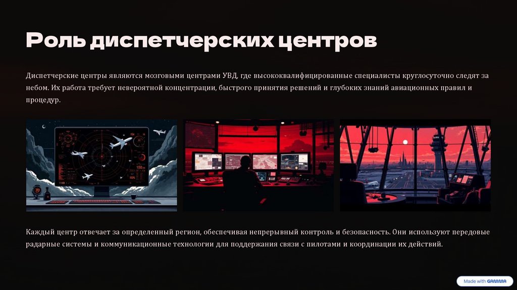Роль диспетчерских центровДиспетчерские центры являются мозговыми центрами УВД, где высококвалифицированные специалисты круглосуточно следят за