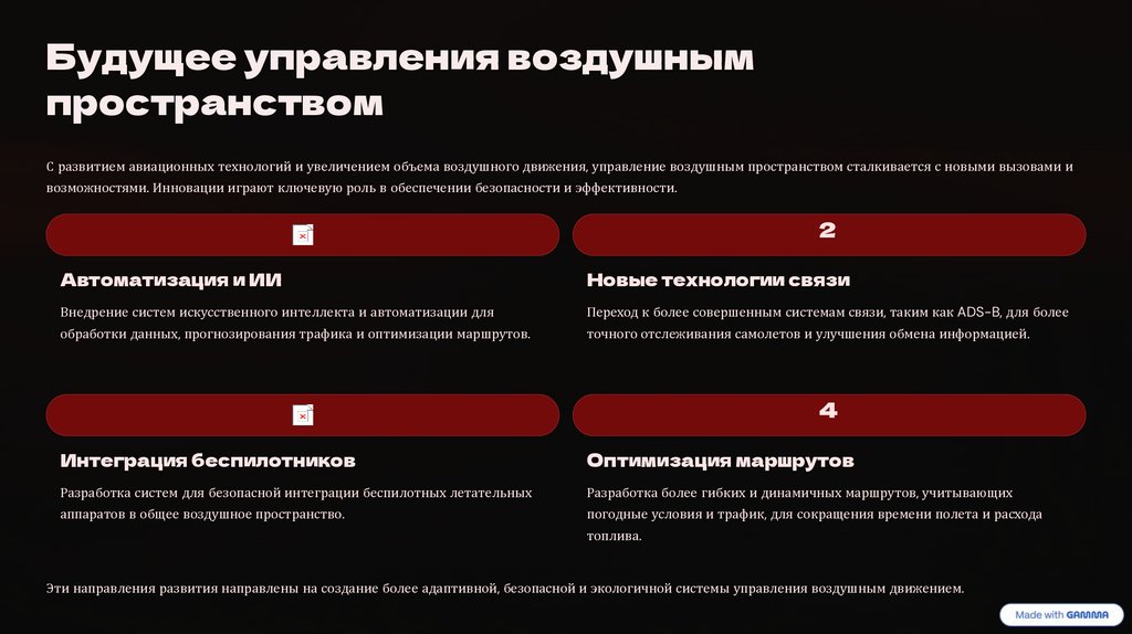 Эти направления развития направлены на создание более адаптивной, безопасной и экологичной системы управления воздушным движением.