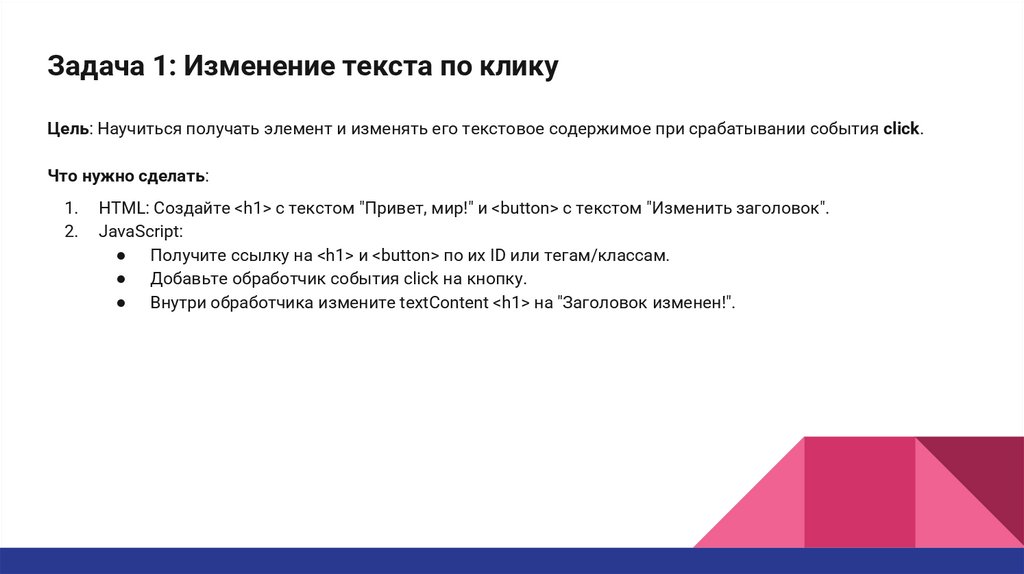 Задача 1: Изменение текста по кликуЦель: Научиться получать элемент и изменять его текстовое содержимое при срабатывании события click.