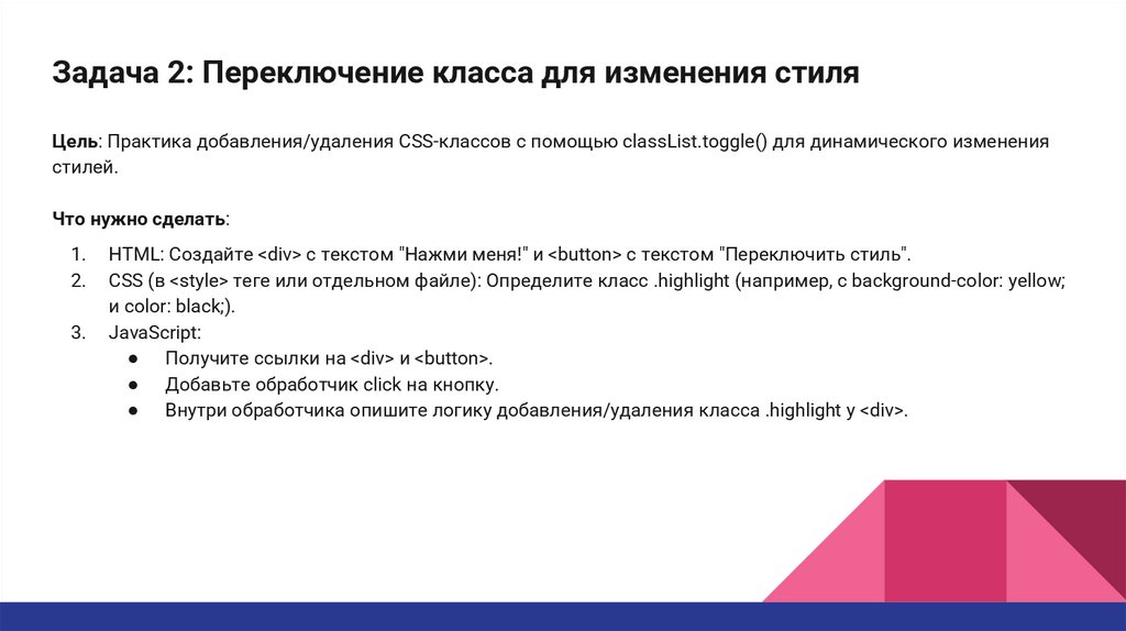 Задача 2: Переключение класса для изменения стиляЦель: Практика добавления/удаления CSS-классов с помощью classList.toggle() для динамического изменения
