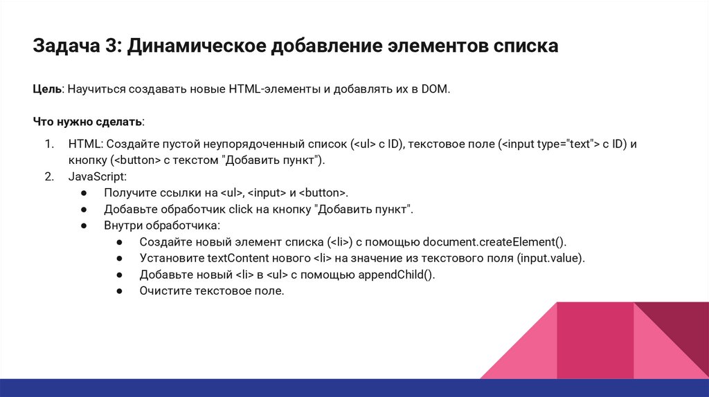 Задача 3: Динамическое добавление элементов спискаЦель: Научиться создавать новые HTML-элементы и добавлять их в DOM.