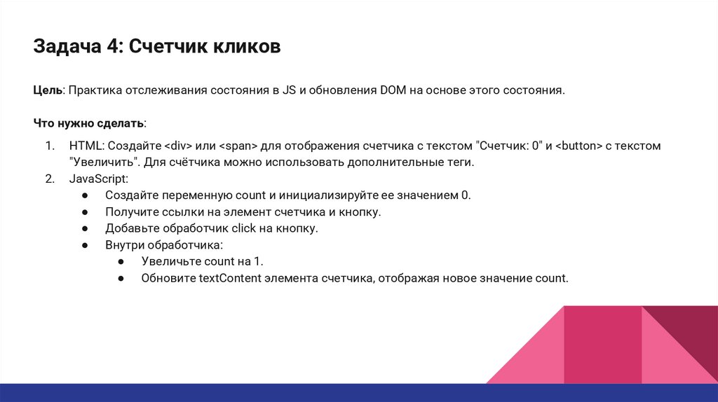 Задача 4: Счетчик кликовЦель: Практика отслеживания состояния в JS и обновления DOM на основе этого состояния.
