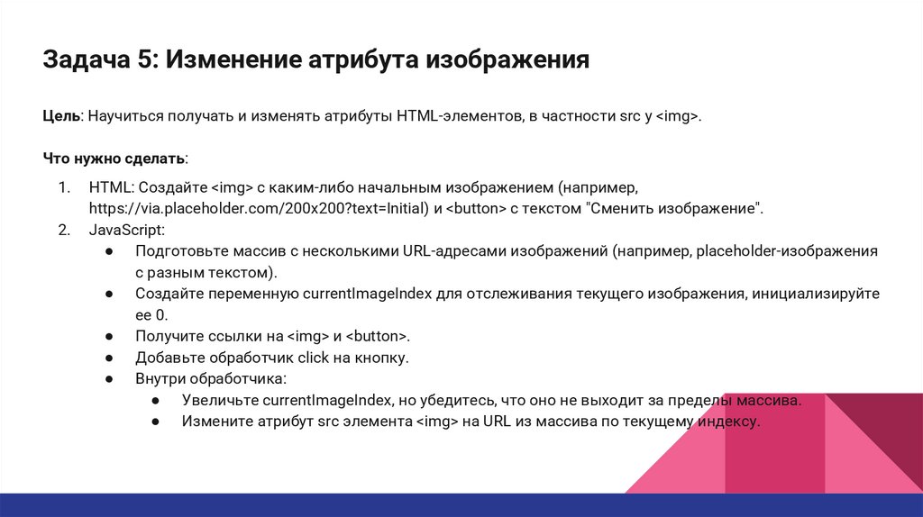 Задача 5: Изменение атрибута изображенияЦель: Научиться получать и изменять атрибуты HTML-элементов, в частности src у <img>.