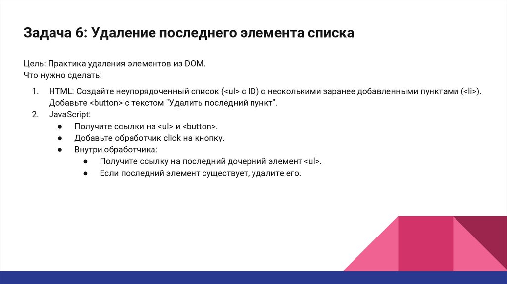 Задача 6: Удаление последнего элемента спискаЦель: Практика удаления элементов из DOM.