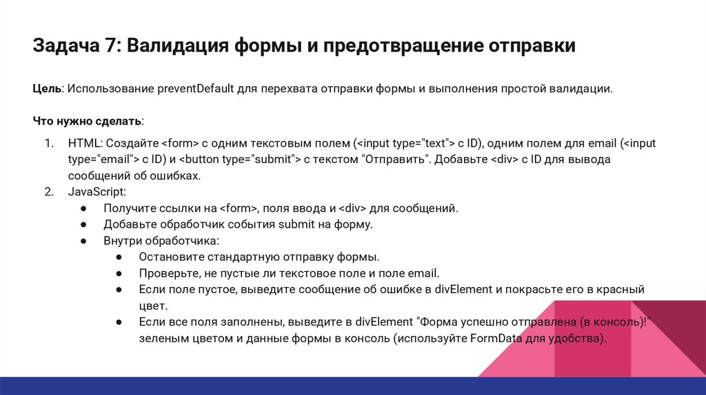 Задача 7: Валидация формы и предотвращение отправкиЦель: Использование preventDefault для перехвата отправки формы и выполнения простой валидации.