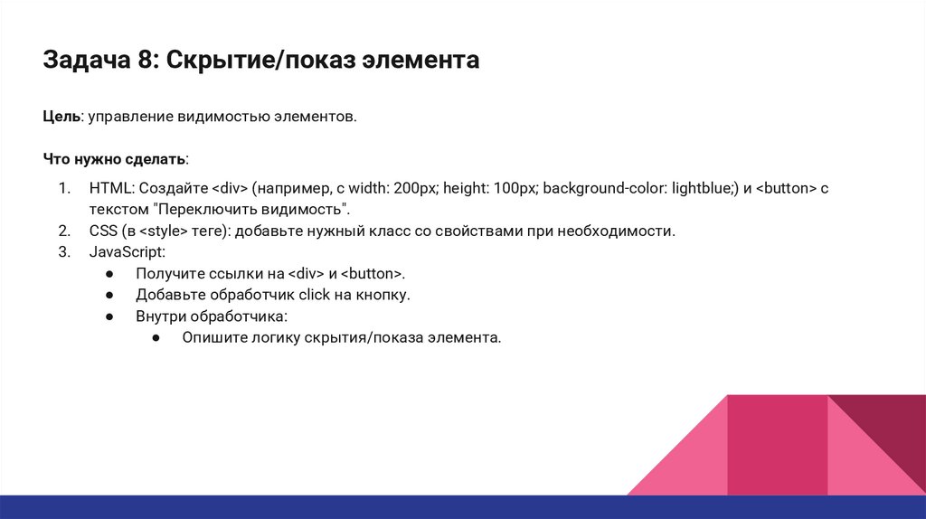 Задача 8: Скрытие/показ элементаЦель: управление видимостью элементов.