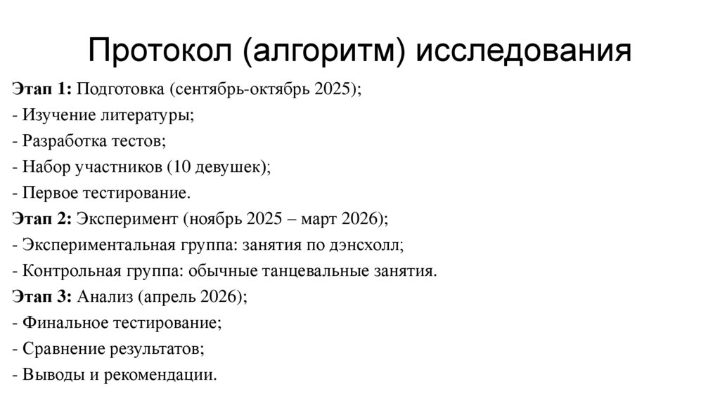 Протокол (алгоритм) исследованияЭтап 1: Подготовка (сентябрь-октябрь 2025);