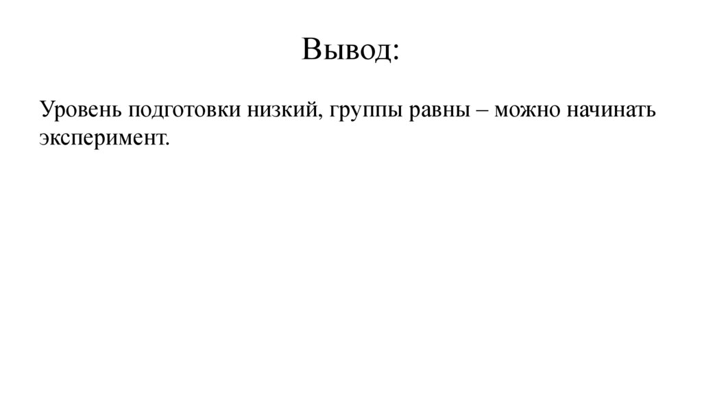 Вывод:Уровень подготовки низкий, группы равны – можно начинать