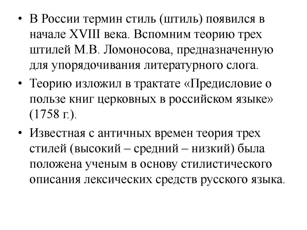 • В России термин стиль (штиль) появился вначале XVIII века. Вспомним теорию трех