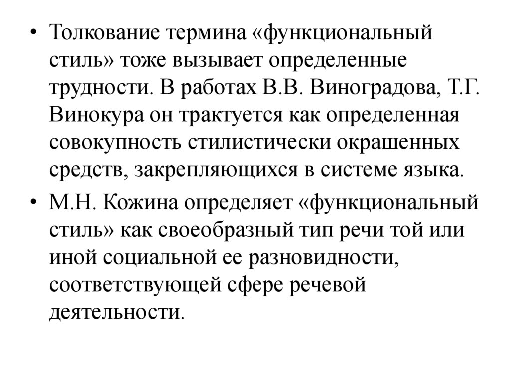 • Толкование термина «функциональныйстиль» тоже вызывает определенные
