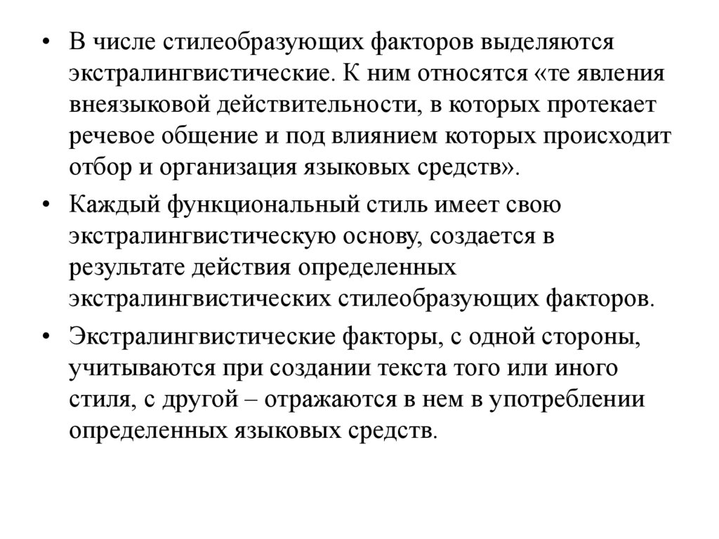 • В числе стилеобразующих факторов выделяютсяэкстралингвистические. К ним относятся «те явления