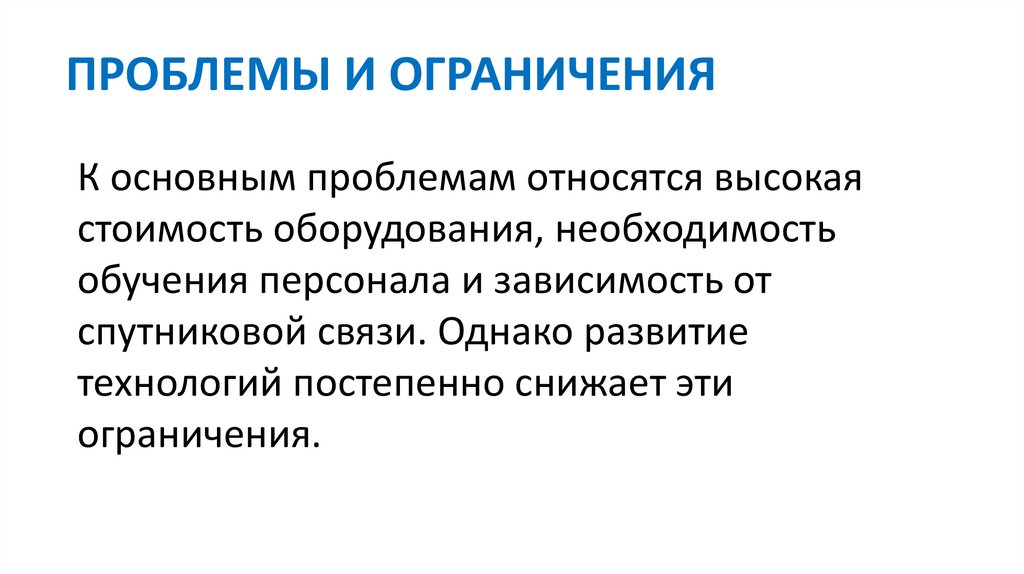ПРОБЛЕМЫ И ОГРАНИЧЕНИЯК основным проблемам относятся высокая
