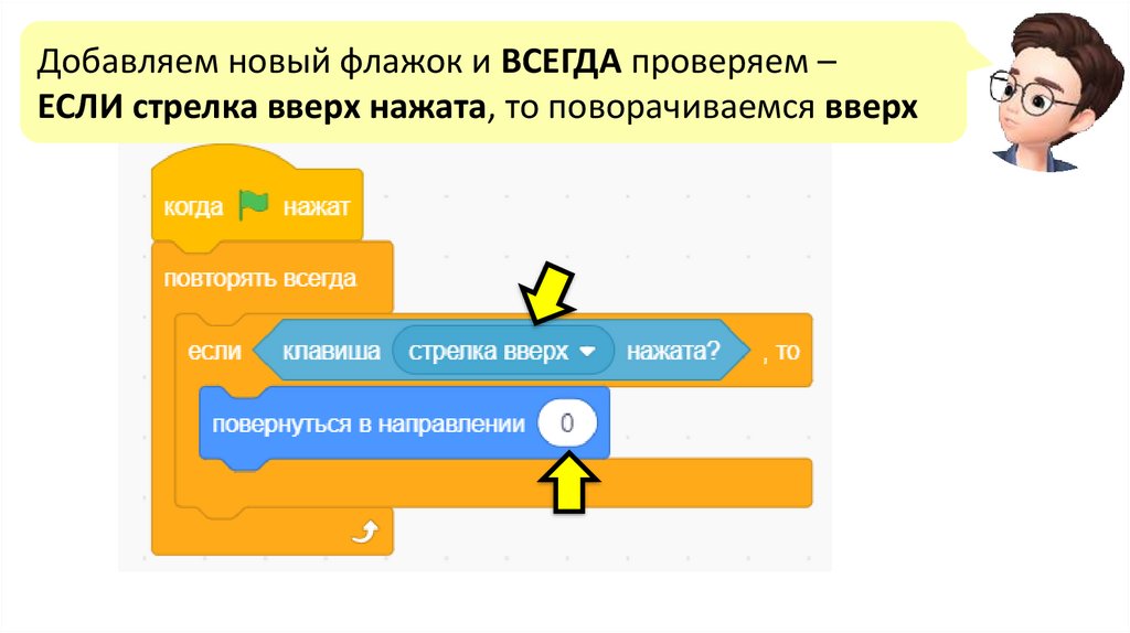 Добавляем новый флажок и ВСЕГДА проверяем –ЕСЛИ стрелка вверх нажата, то поворачиваемся вверх
