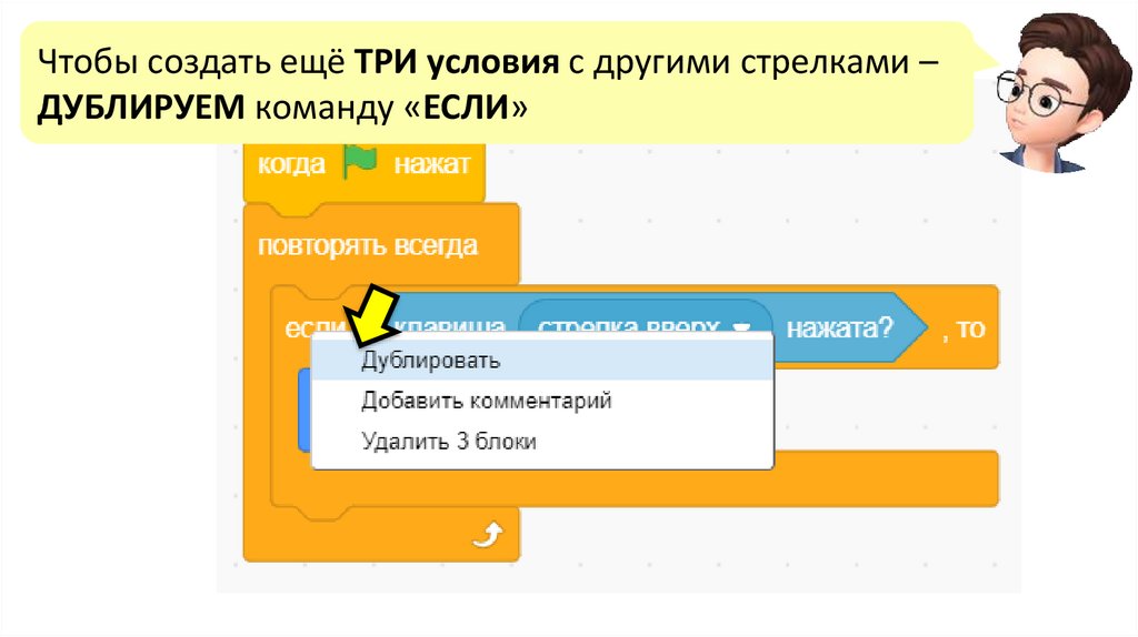 Чтобы создать ещё ТРИ условия с другими стрелками –ДУБЛИРУЕМ команду «ЕСЛИ»
