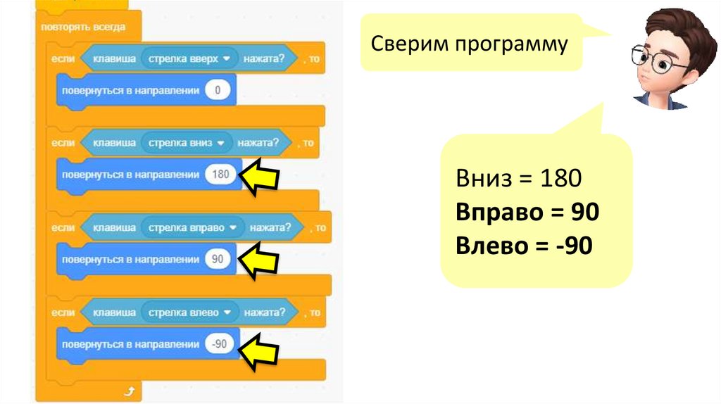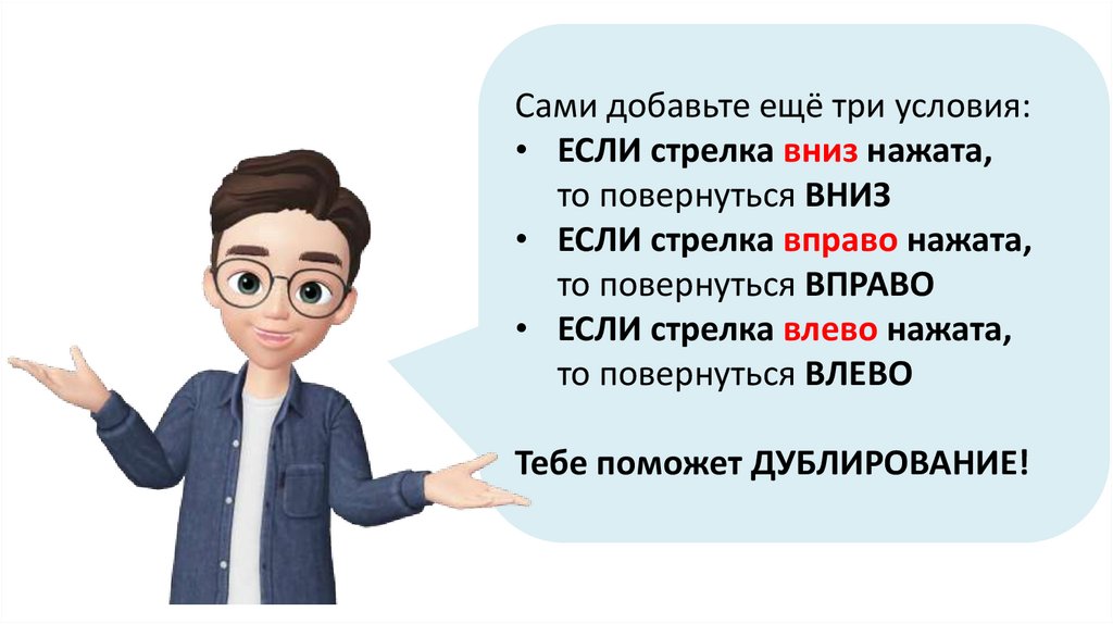 Сами добавьте ещё три условия:• ЕСЛИ стрелка вниз нажата,