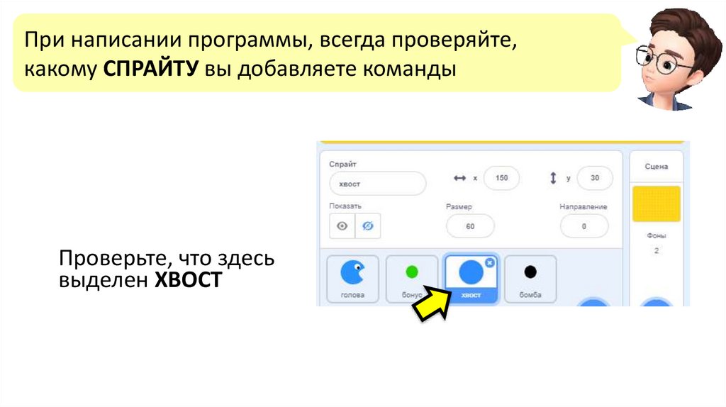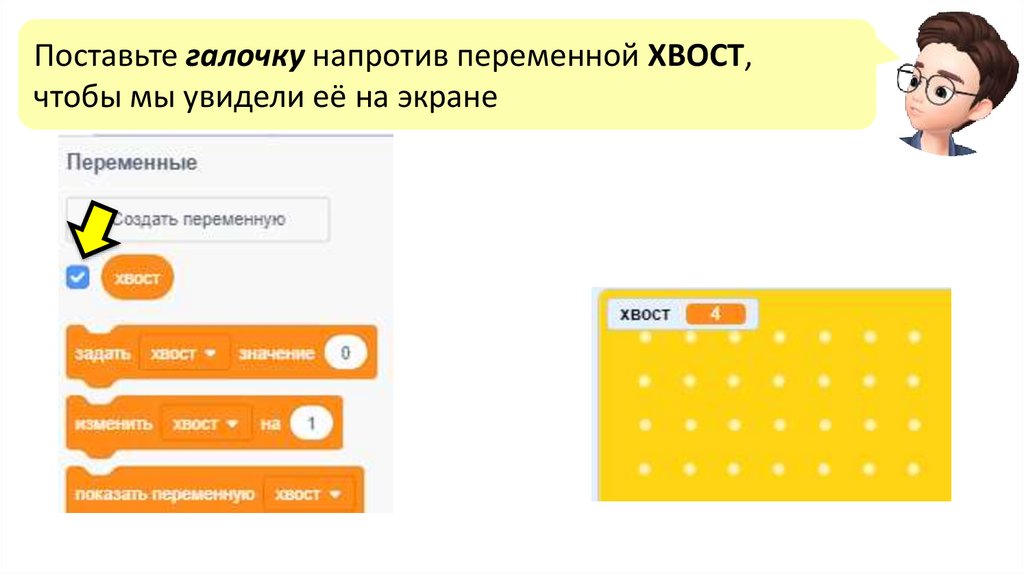Поставьте галочку напротив переменной ХВОСТ,чтобы мы увидели её на экране