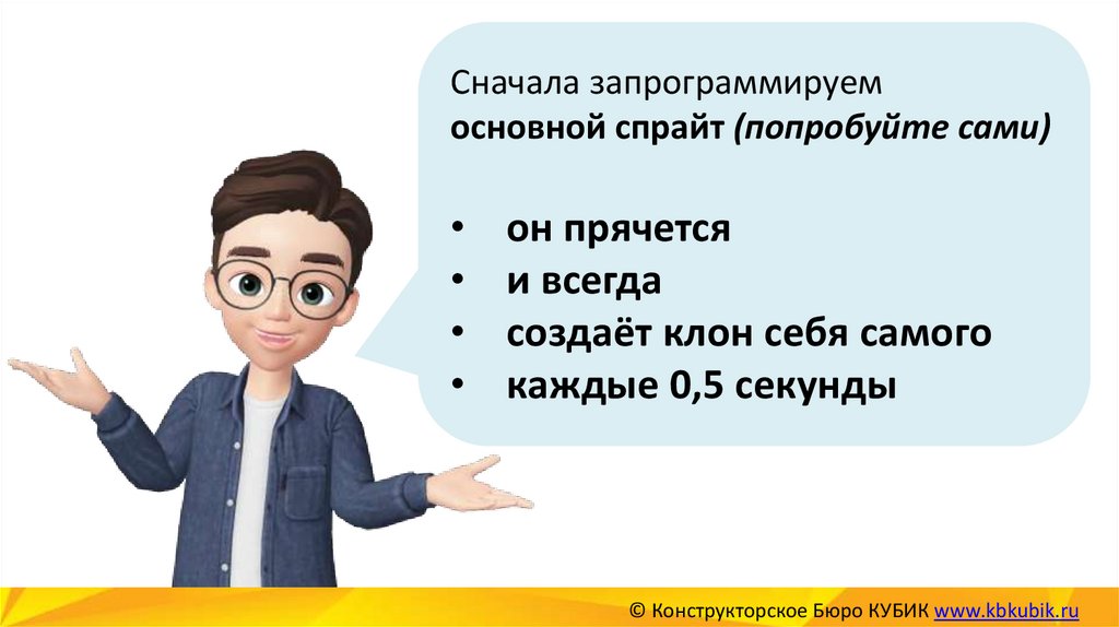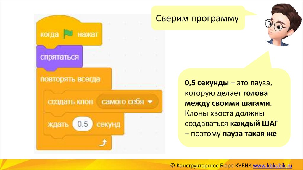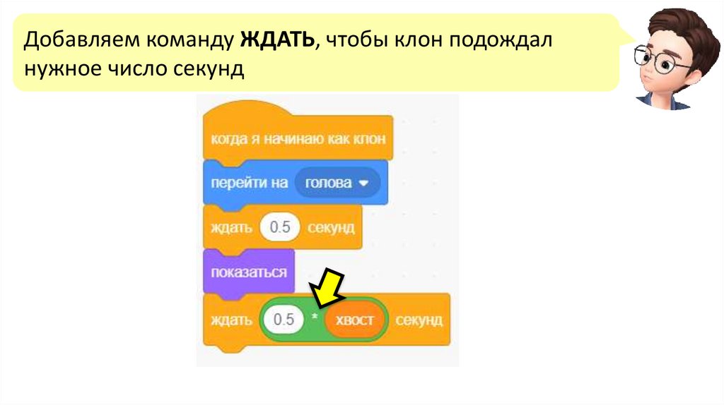 Добавляем команду ЖДАТЬ, чтобы клон подождалнужное число секунд