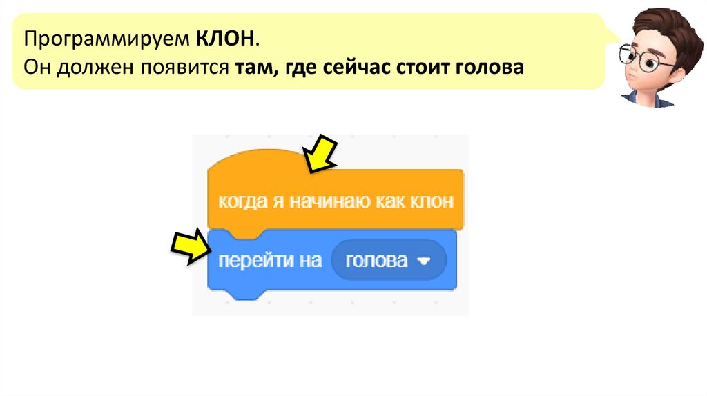 Программируем КЛОН.Он должен появится там, где сейчас стоит голова