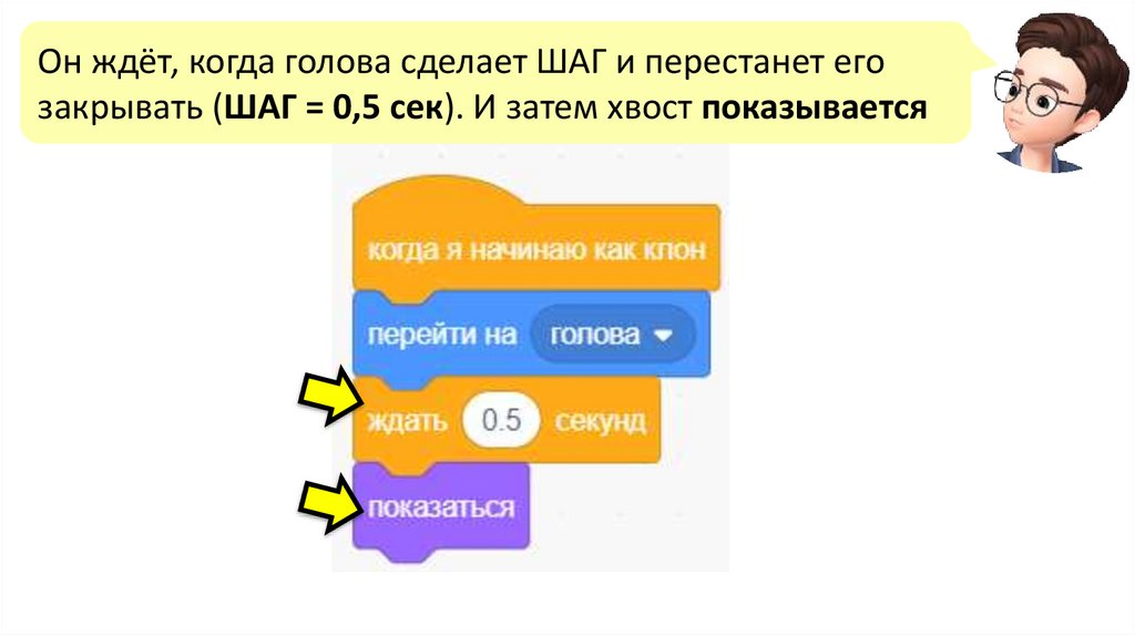 Он ждёт, когда голова сделает ШАГ и перестанет егозакрывать (ШАГ = 0,5 сек). И затем хвост показывается