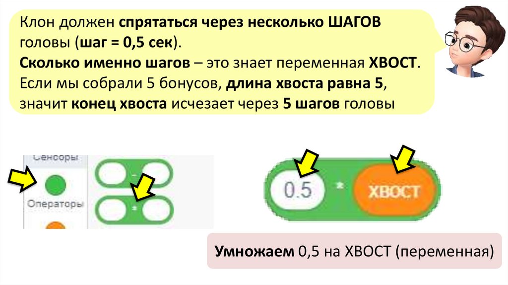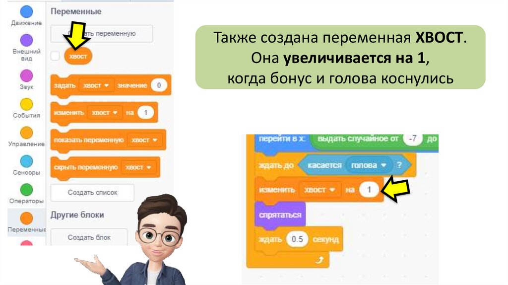 Также создана переменная ХВОСТ.Она увеличивается на 1,
