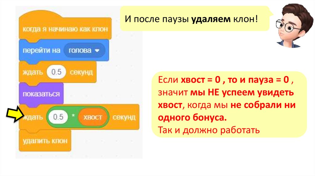 И после паузы удаляем клон!Если хвост = 0 , то и пауза = 0 ,