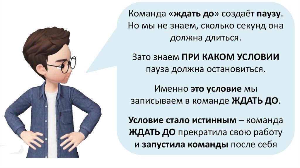 Команда «ждать до» создаёт паузу.Но мы не знаем, сколько секунд она