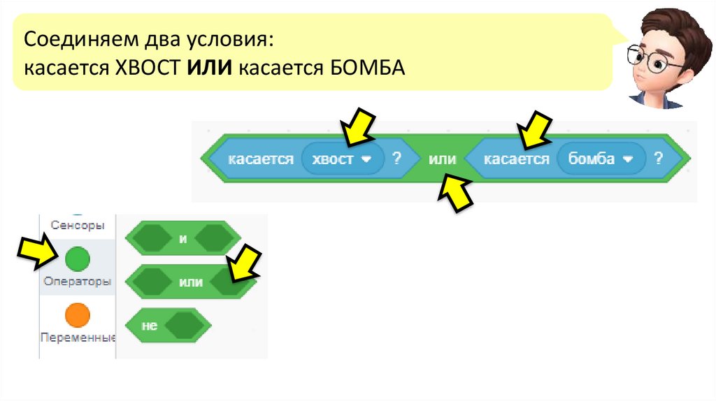 Соединяем два условия:касается ХВОСТ ИЛИ касается БОМБА