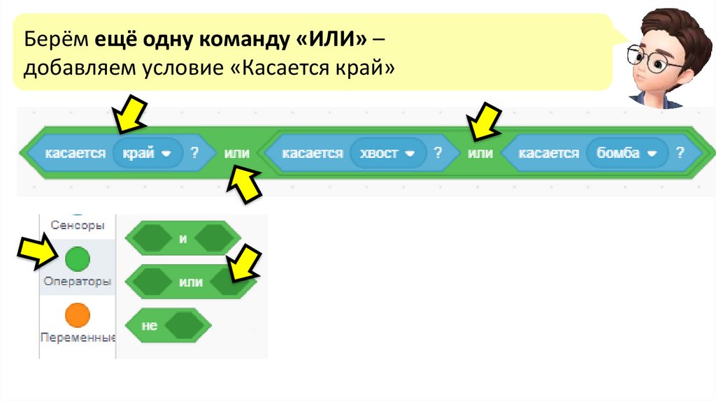 Берём ещё одну команду «ИЛИ» –добавляем условие «Касается край»