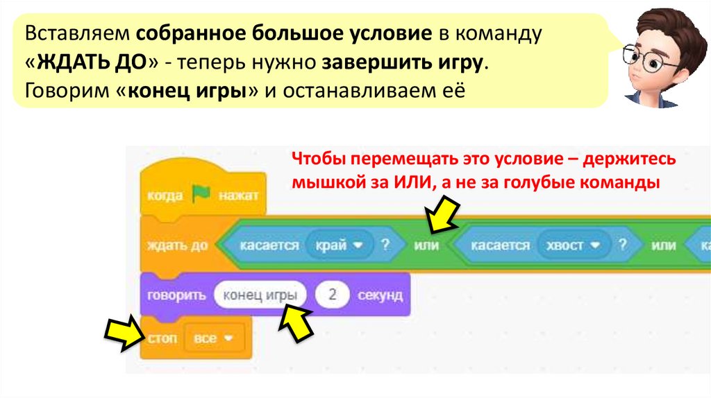 Вставляем собранное большое условие в команду«ЖДАТЬ ДО» - теперь нужно завершить игру.