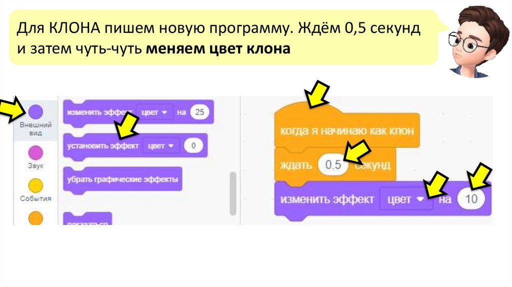 Для КЛОНА пишем новую программу. Ждём 0,5 секунди затем чуть-чуть меняем цвет клона