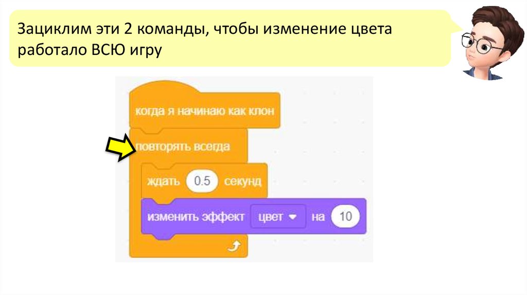 Зациклим эти 2 команды, чтобы изменение цветаработало ВСЮ игру