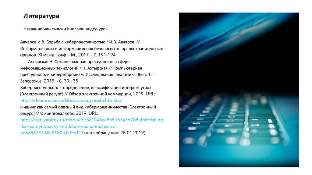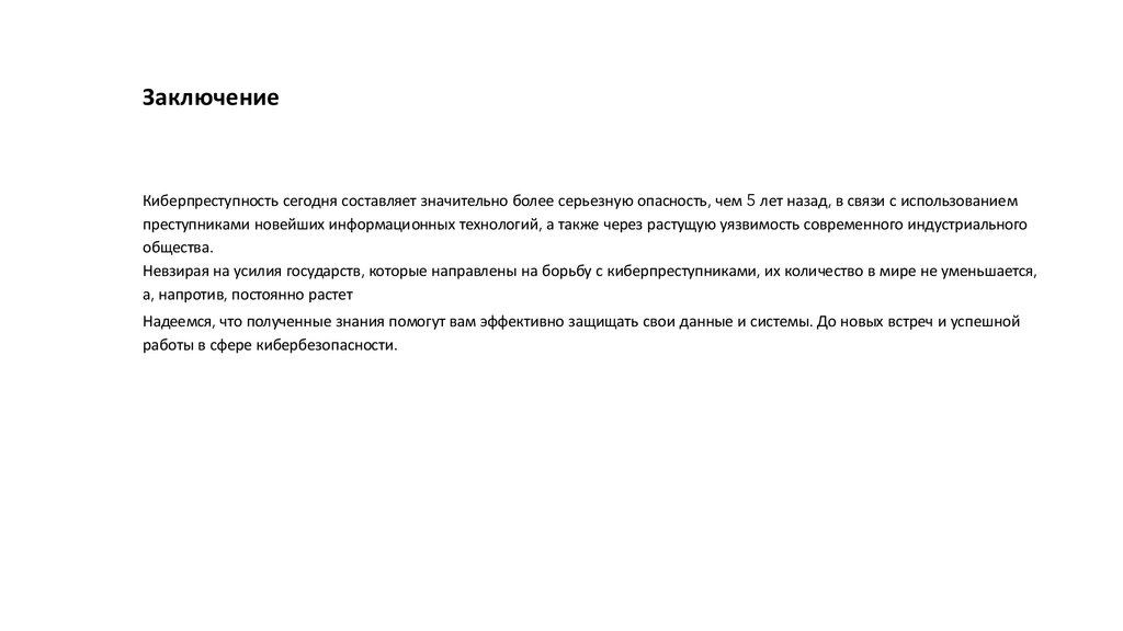 ЗаключениеКиберпреступность сегодня составляет значительно более серьезную опасность, чем 5 лет назад, в связи с использованием
