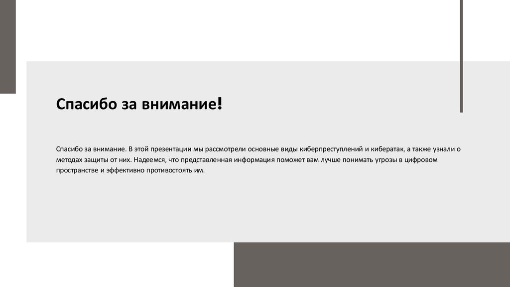 Спасибо за внимание!Спасибо за внимание. В этой презентации мы рассмотрели основные виды киберпреступлений и кибератак, а также узнали о