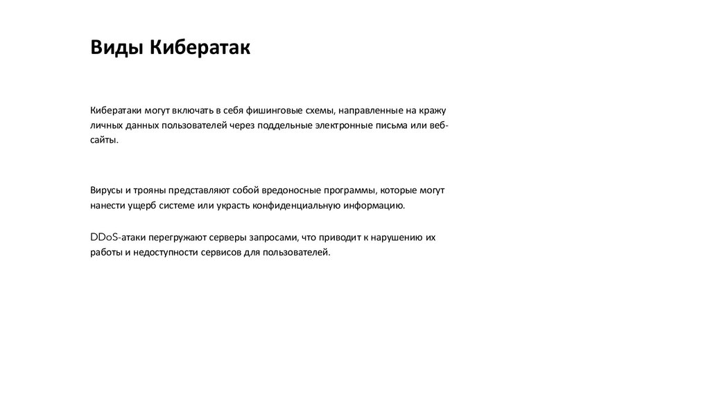 Виды КибератакКибератаки могут включать в себя фишинговые схемы, направленные на кражу