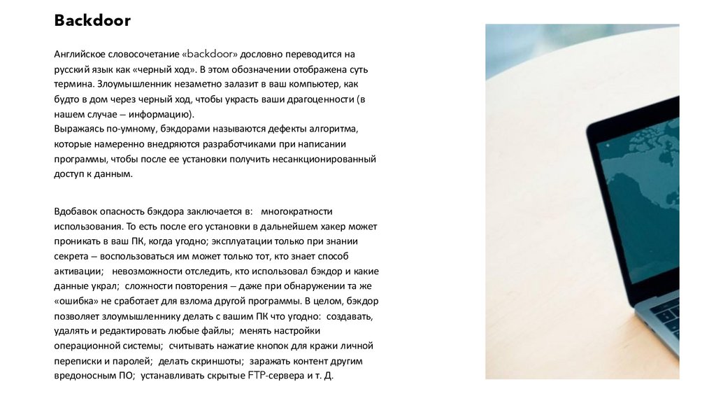 BackdoorАнглийское словосочетание «backdoor» дословно переводится на