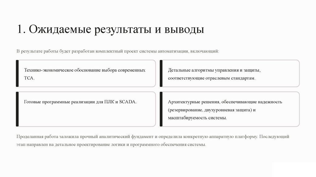 1. Ожидаемые результаты и выводыВ результате работы будет разработан комплектный проект системы автоматизации, включающий: