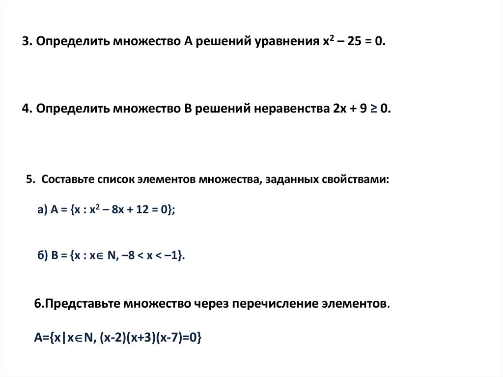 3. Определить множество А решений уравнения х2 – 25 = 0.4. Определить множество В решений неравенства 2х + 9 ≥ 0.