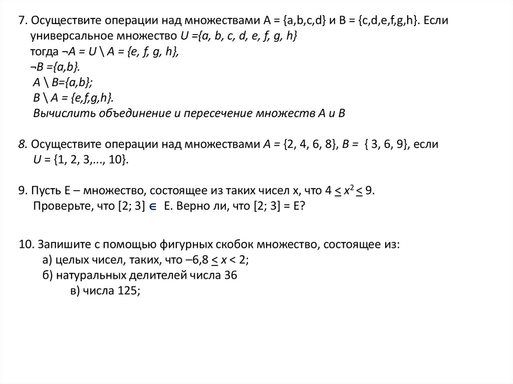 7. Осуществите операции над множествами A = {a,b,c,d} и B = {c,d,e,f,g,h}. Еслиуниверсальное множество U ={a, b, с, d, e, f, g, h}