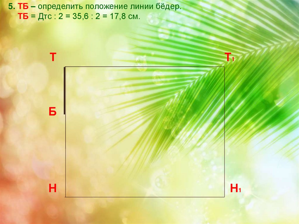 5. ТБ – определить положение линии бёдер.ТБ = Дтс : 2 = 35,6 : 2 = 17,8 см.