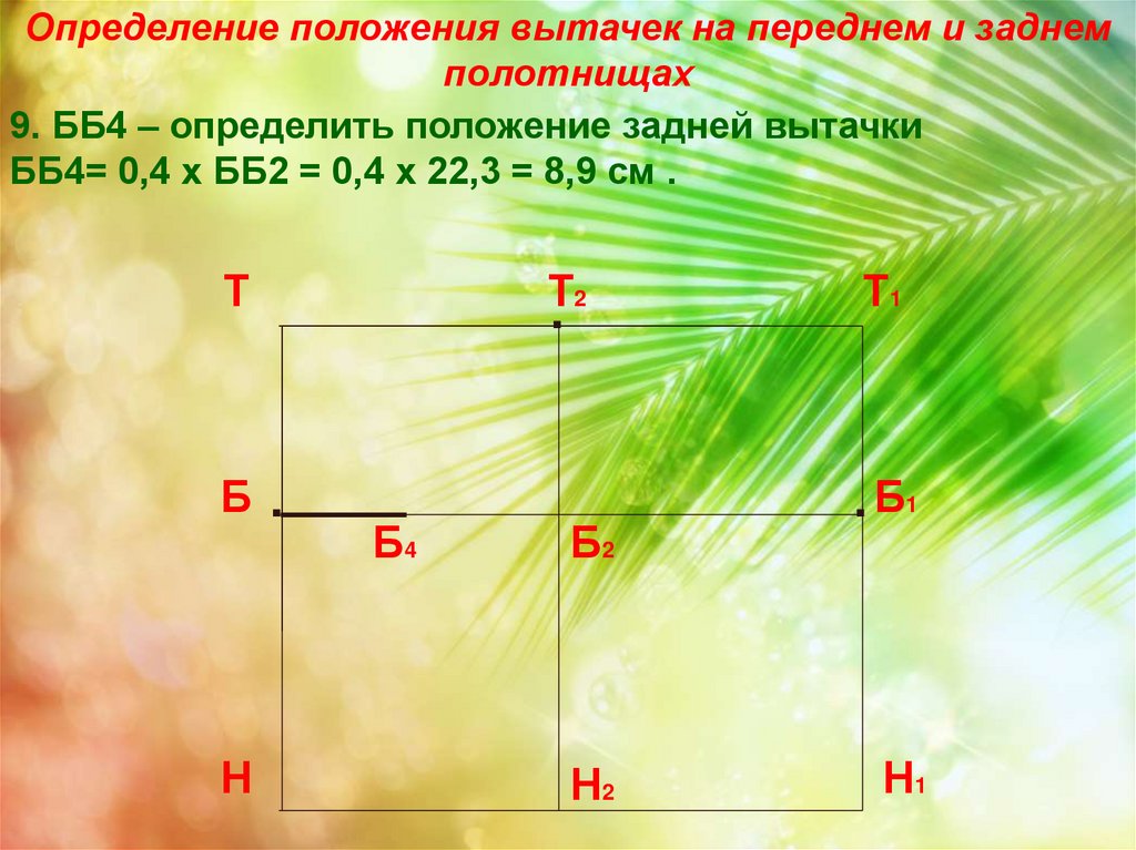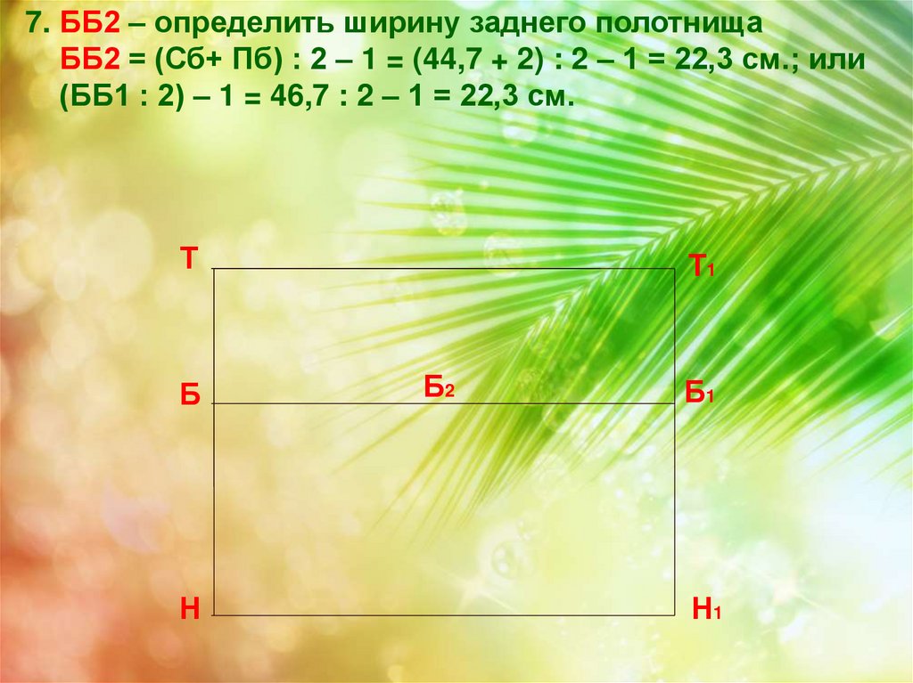 7. ББ2 – определить ширину заднего полотнищаББ2 = (Сб+ Пб) : 2 – 1 = (44,7 + 2) : 2 – 1 = 22,3 см.; или