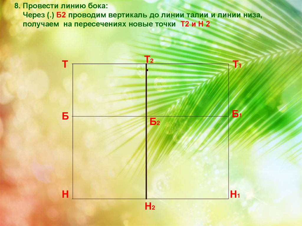 8. Провести линию бока:Через (.) Б2 проводим вертикаль до линии талии и линии низа,