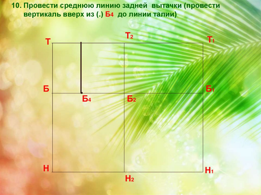 10. Провести среднюю линию задней вытачки (провестивертикаль вверх из (.) Б4 до линии талии)