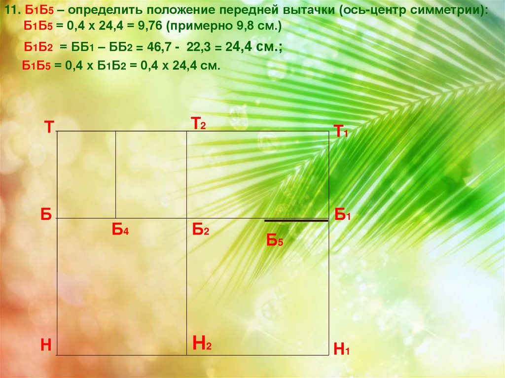11. Б1Б5 – определить положение передней вытачки (ось-центр симметрии):Б1Б5 = 0,4 х 24,4 = 9,76 (примерно 9,8 см.)