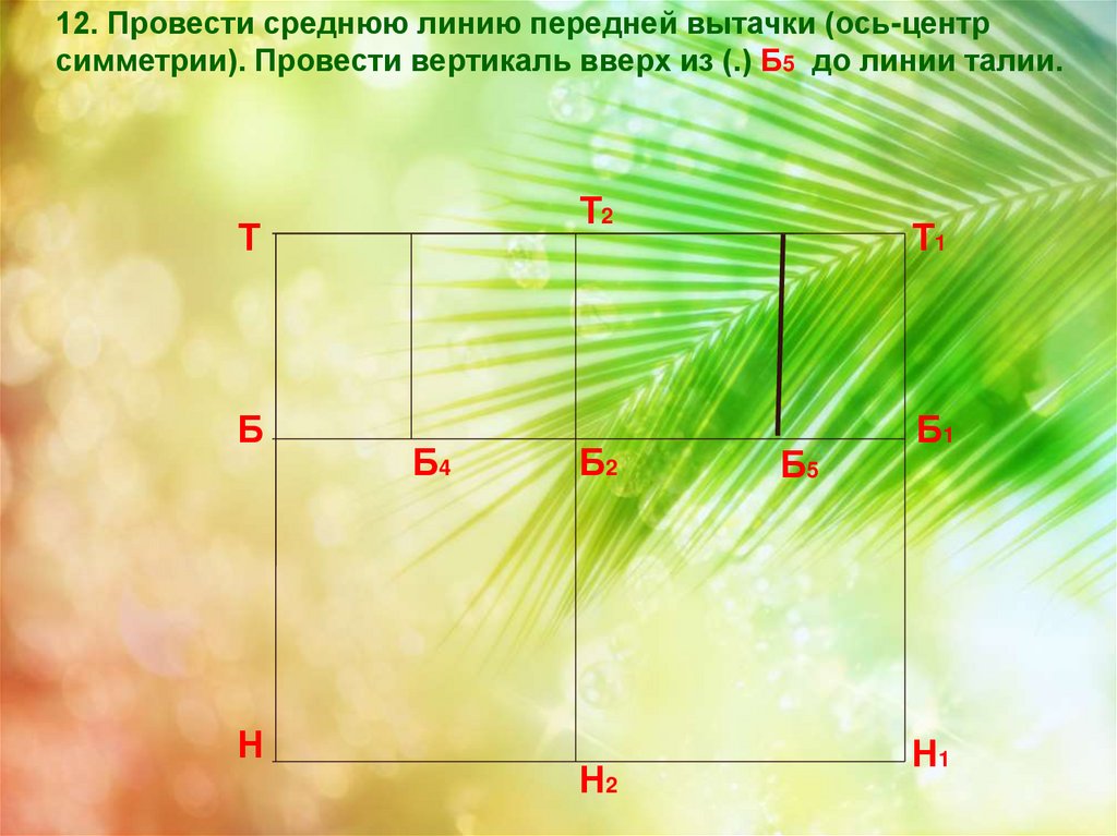 12. Провести среднюю линию передней вытачки (ось-центрсимметрии). Провести вертикаль вверх из (.) Б5 до линии талии.