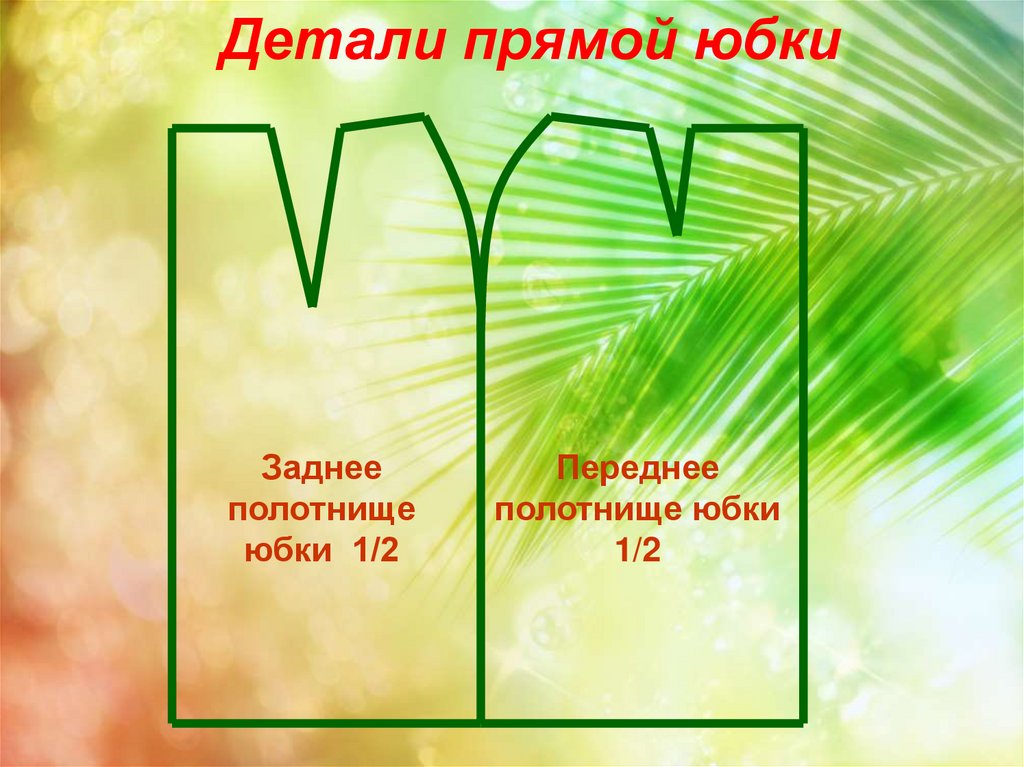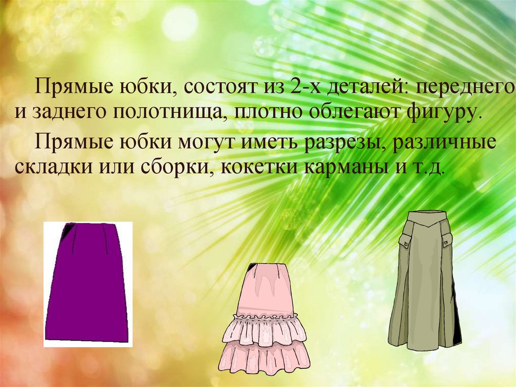 Прямые юбки, состоят из 2-х деталей: переднегои заднего полотнища, плотно облегают фигуру.